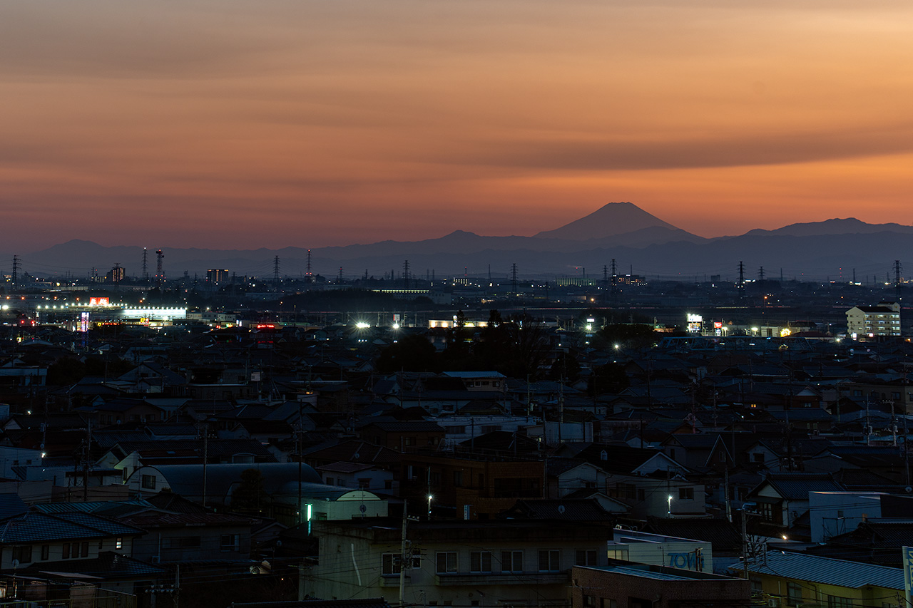 周辺は住宅街がメインで高さもそれほどないため、夜景の規模としては控えめと言わざるを得ません。しかし、トワイライトタイムには富士山のシルエットが美しく浮かび上がるため、撮影目的であればこの時間帯を狙うのがベストでしょう。