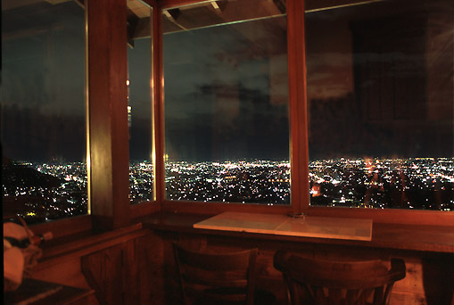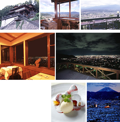 このお店の特徴はこれだけに終わりません。まず1Fはカフェ(上段右の写真)。もちろんオープンテラス席が中心で、室内席からも夜景が見えるような造りになっています。そして2Fに上がると、ウェイティングバー&ワインバー(上段中、中段の写真)とフレンチレストラン(下段左の写真)があります。ウェイティングバーは、3組のみのスペースで、全席窓側シートであり、100%夜景を堪能できます。またフレンチレストランは、イタリア家具が揃えられてカフェとは違う雰囲気をかもしだしています。