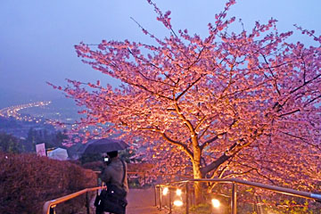 その後、メインイベントの松田山ハーブガーデンの河津桜会場へ。雨天のため、比較的空いていて、のんびりと桜を楽しめます。ここからは、小田原方面の夜景をバックに、夜桜のライトアップを楽しめるスポットですが、雨天のため、夜桜鑑賞がメインに。それでも、その光景は見事です。また来年リベンジですね。