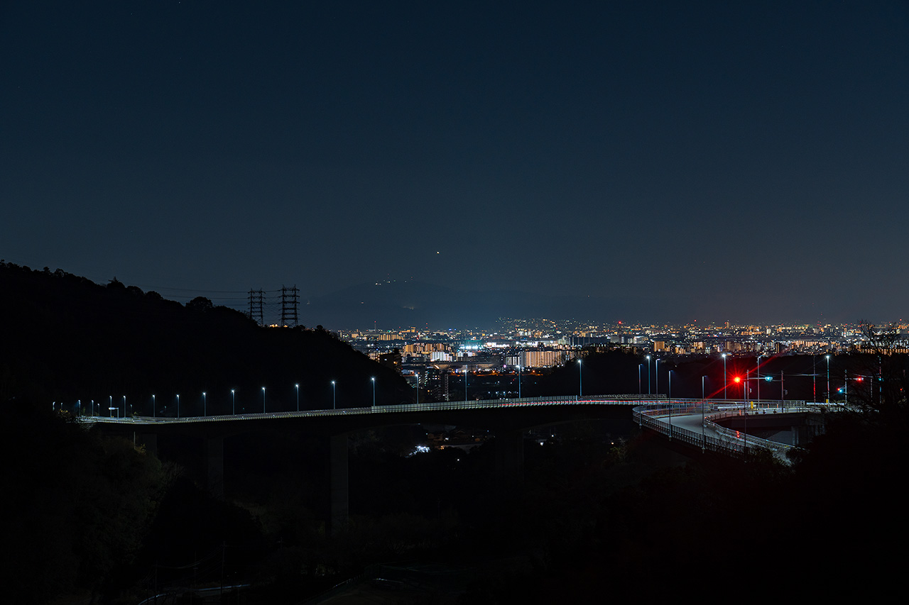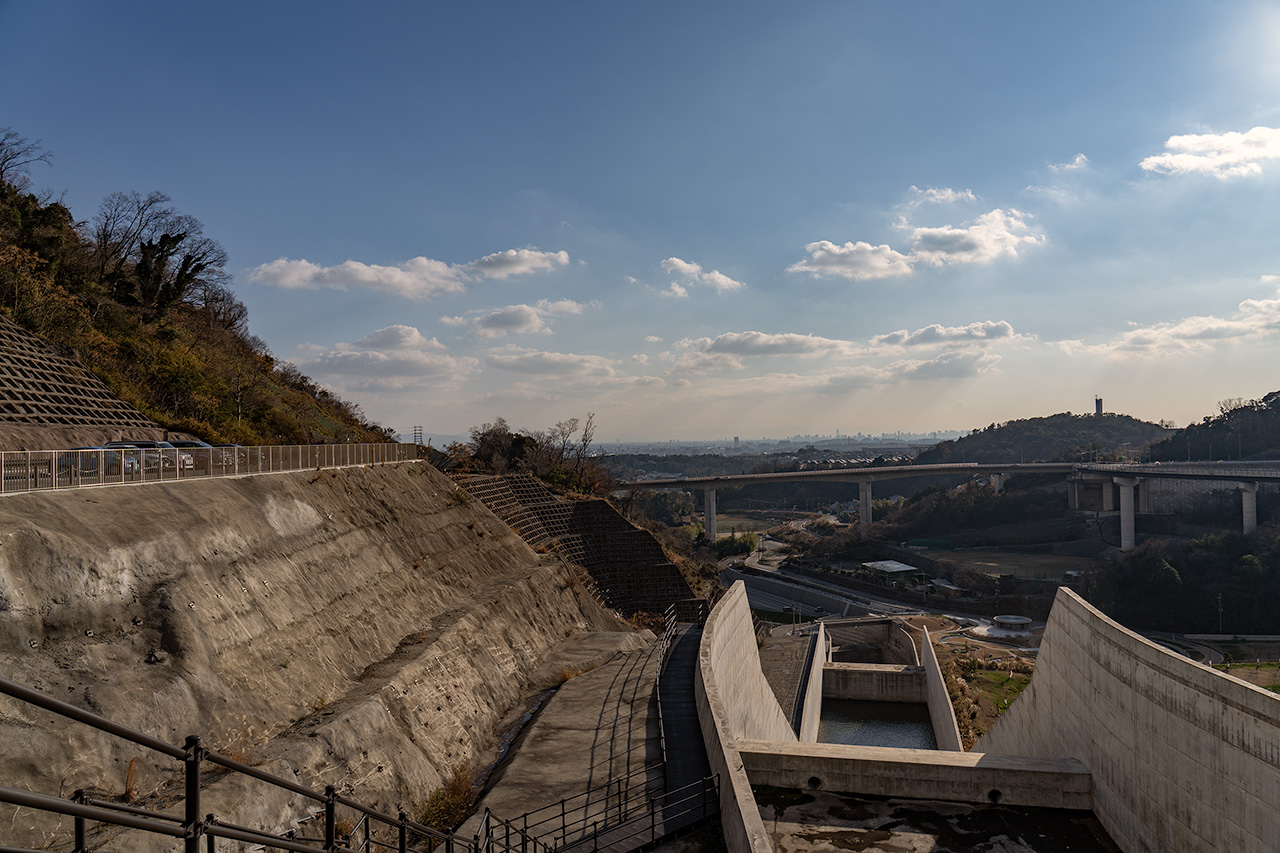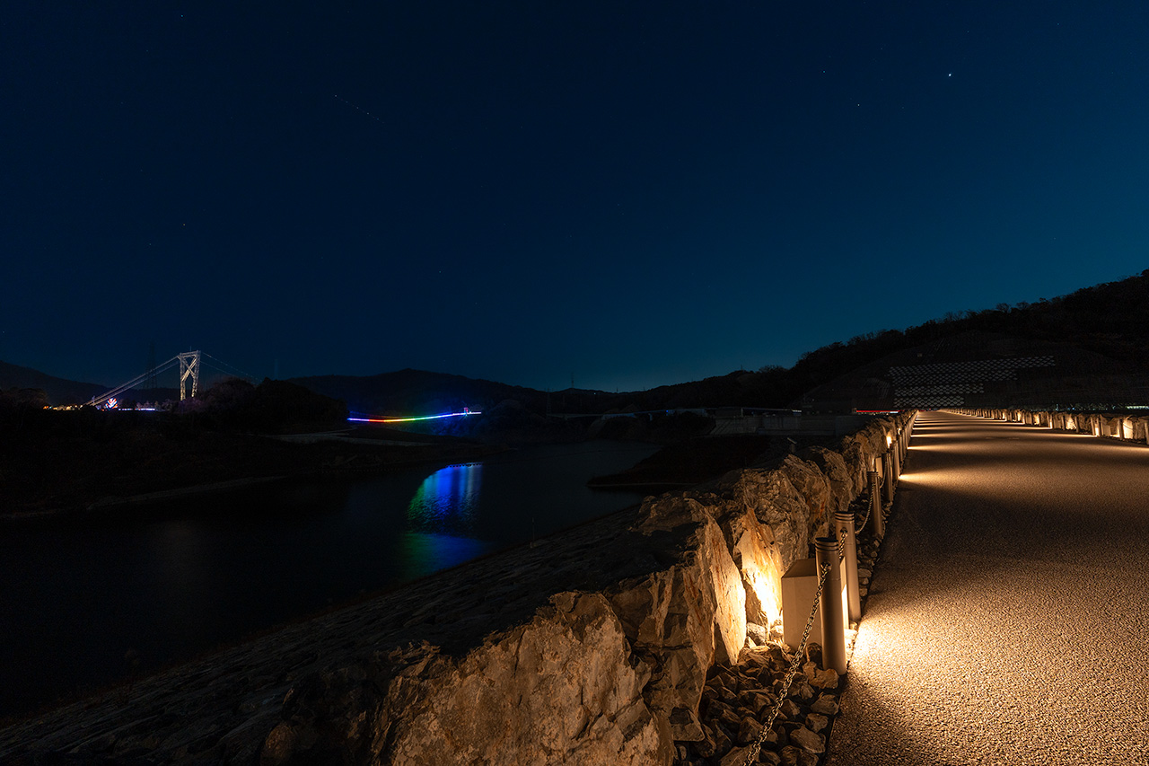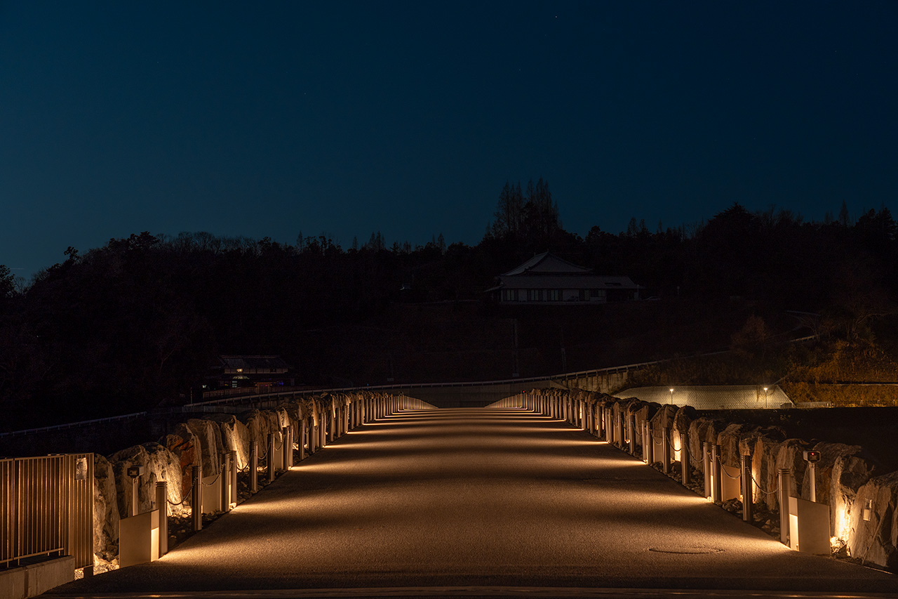 ここからは新東名高速の茨木千提寺ICへと繋がる府道46号線越しに、茨木市方面の夜景が広がります。またダム天端道路の両サイドは巨石によって構成され、重厚感ある雰囲気で、かつライトアップされた光りにより石が立体的に浮かび上がり、柔らかな空間に仕上がっています。