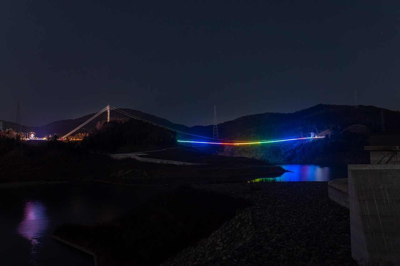 また北側には日本最長となる全長420mの吊り橋「GODA BRIDGE(ゴウダブリッジ)」が広がります。この吊り橋は冬季(2025年度は2025年12月24日~2026年2月末)にライトアップされており、7色のイルミネーションがダム湖面に反射する様子も美しいです。