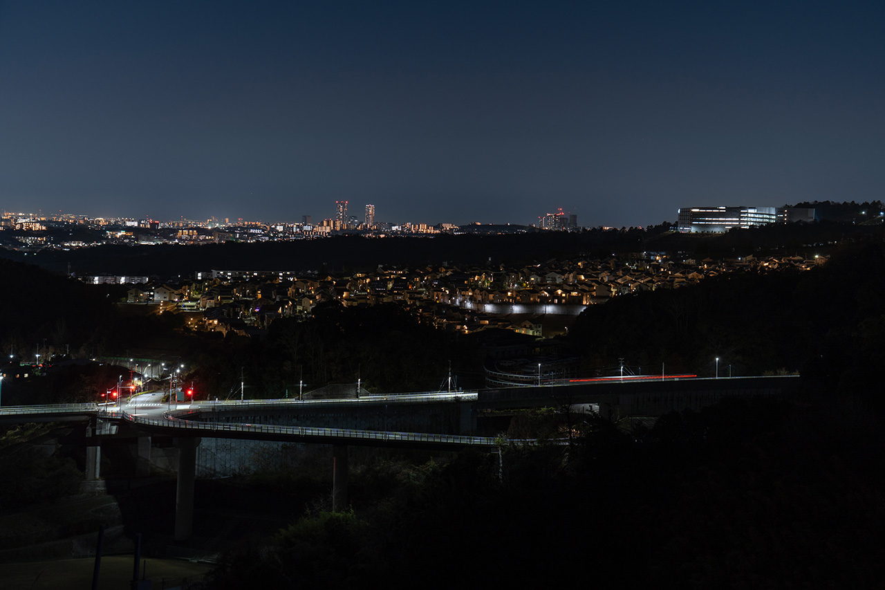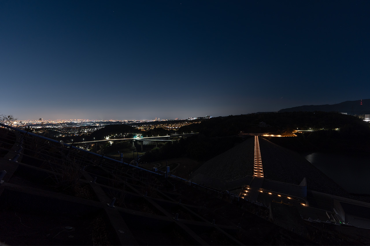 2024年完成の安威川ダム。ダムを見下ろせる展望所からは、オレンジに輝く天端道路の光と、茨木・吹田方面の美しい夜景を楽しめます。