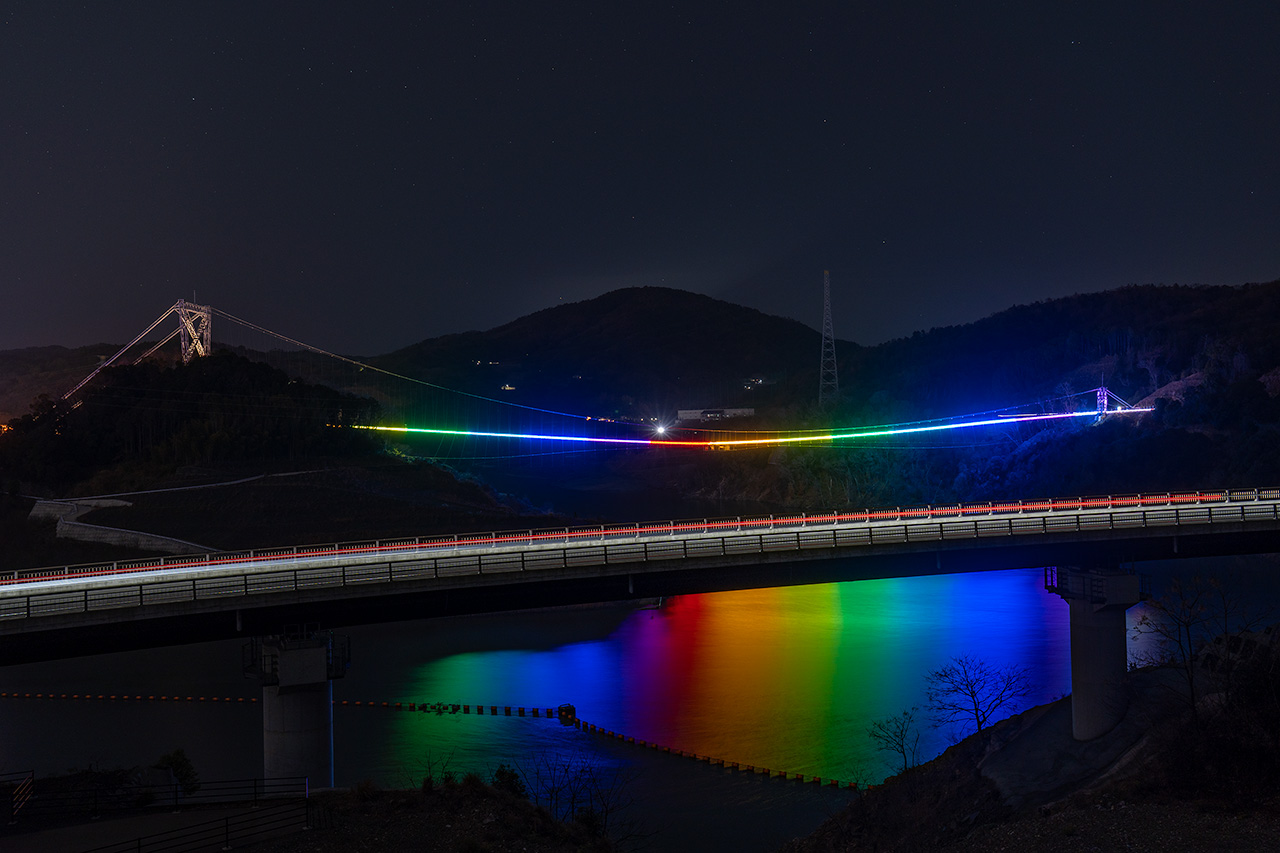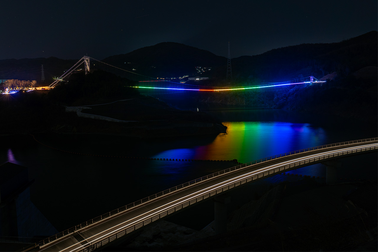 ここからは茨木市・吹田市方面の夜景を眺められ、手前にはオレンジ色にライトアップされたダム天端(てんば)道路、そして北側には日本最長となる全長420mの吊り橋「GODA BRIDGE(ゴウダブリッジ)」が広がります。この吊り橋は冬季(2025年度は2025年12月24日~2026年2月末)にライトアップされており、7色のイルミネーションがダム湖面に反射する、実に美しい光景を堪能できます。