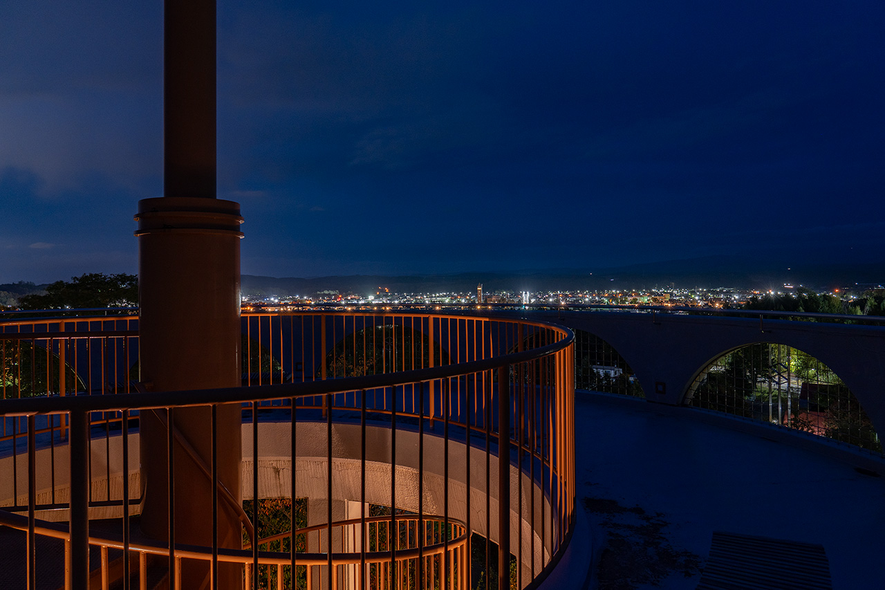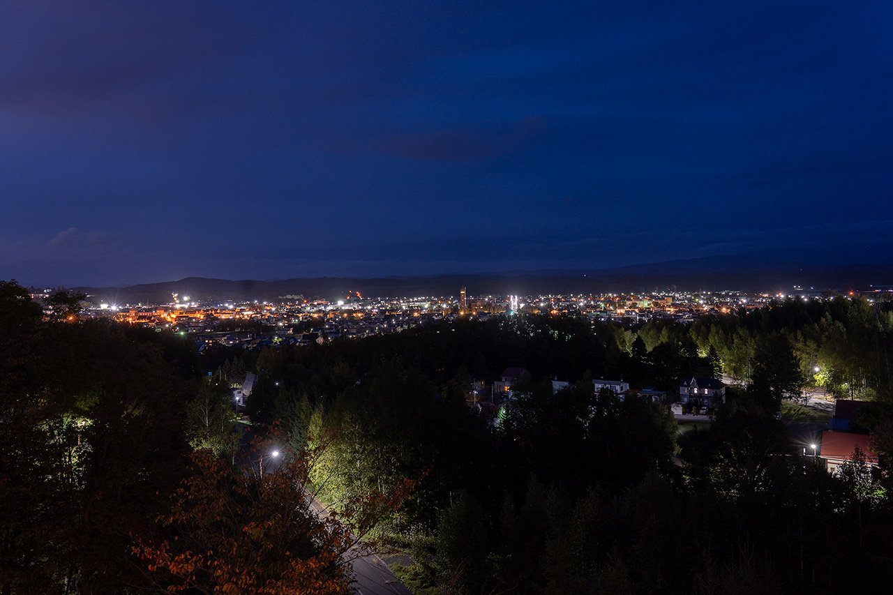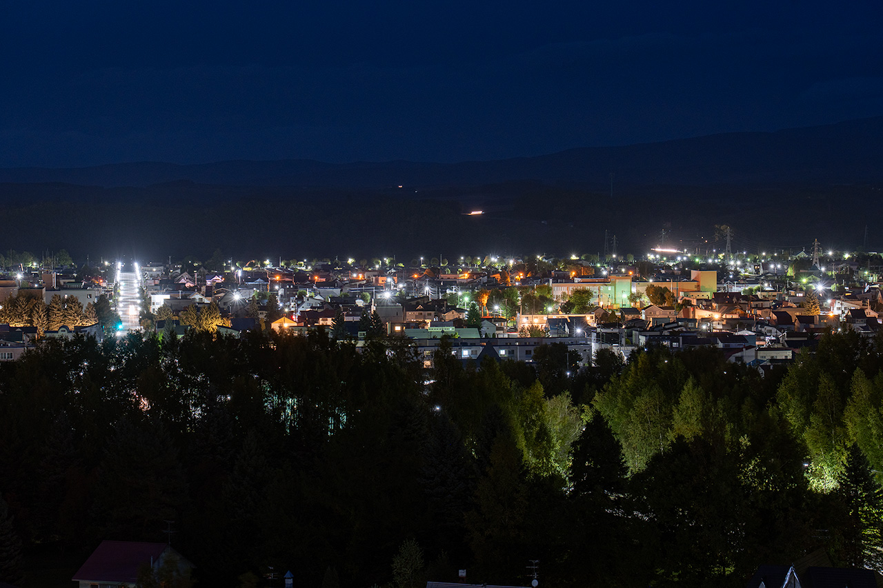 らせん階段の展望台からは、美瑛町の中心部を一望できます。住宅街と外灯のみの明かりで、光量は少なめです。ただトワイライトタイムであれば山並みのシルエットと合わさり、自然と融合した町夜景を楽しめました。