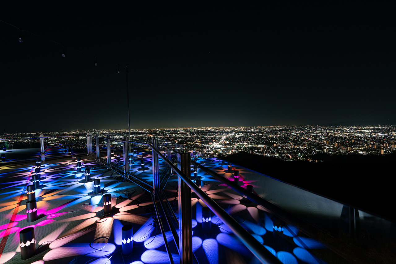 またイベントが行われていることもあり、2025年11月に取材したときには、「天空のお花畑」というイベントがあり、展望デッキが彩り豊かにライトアップされていました。