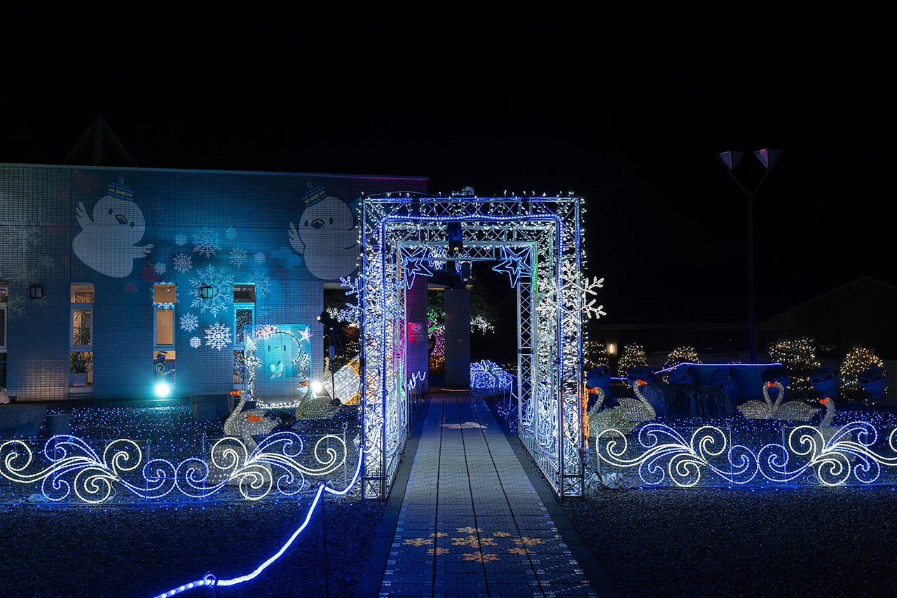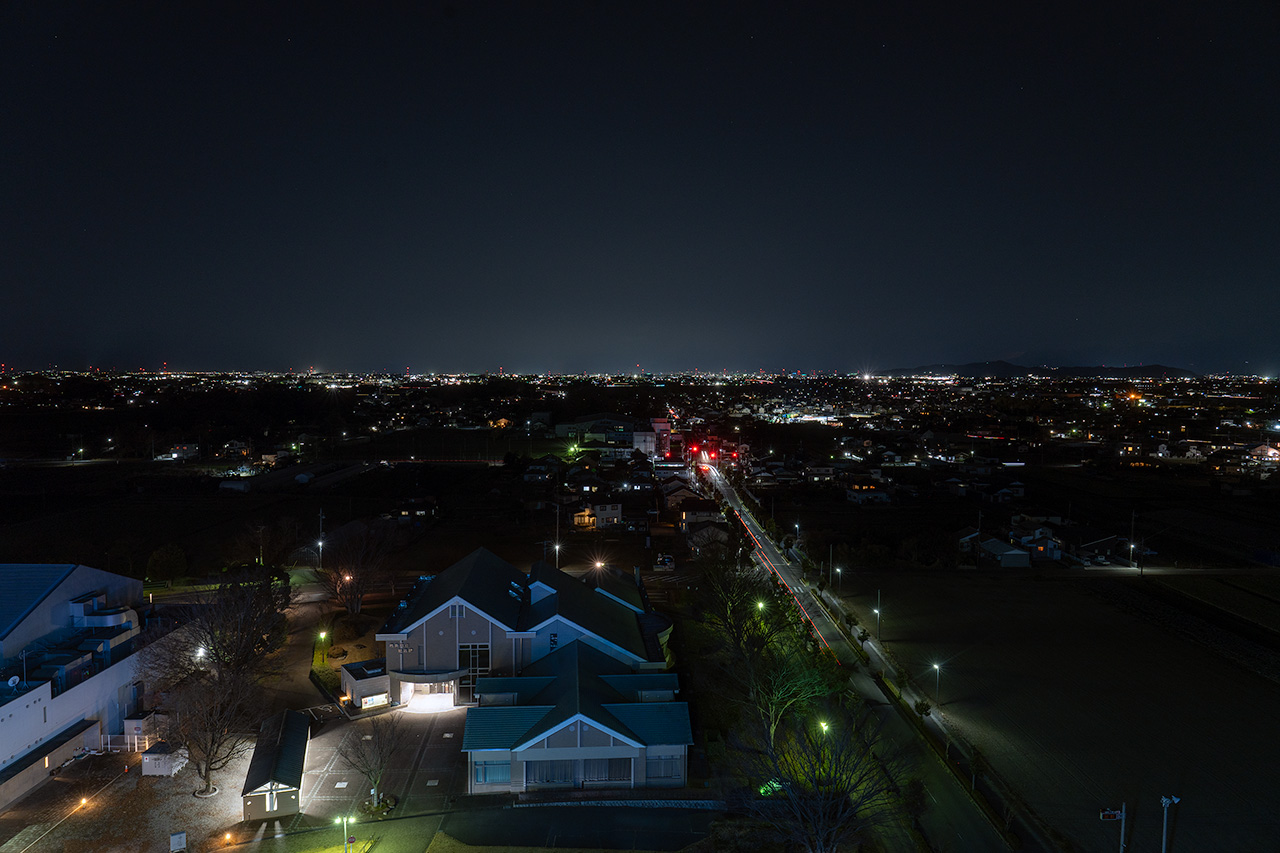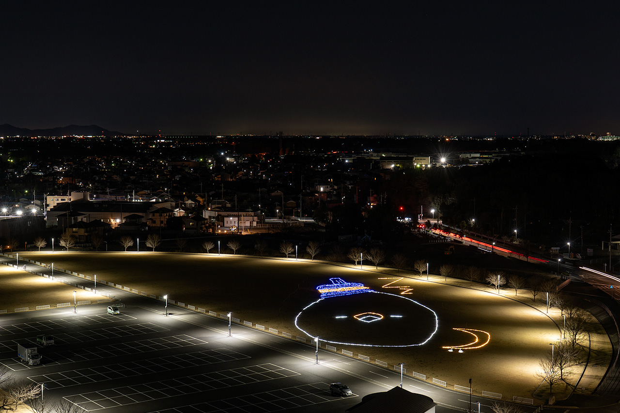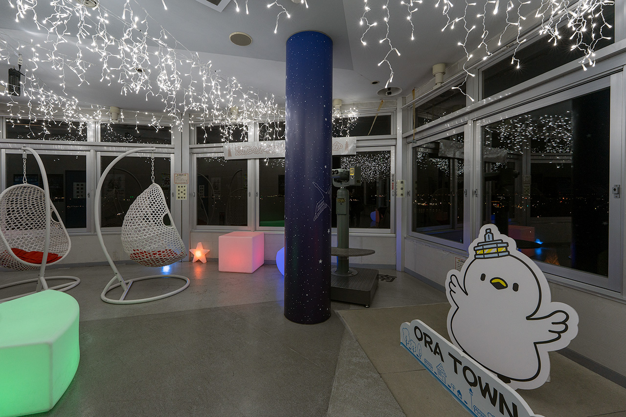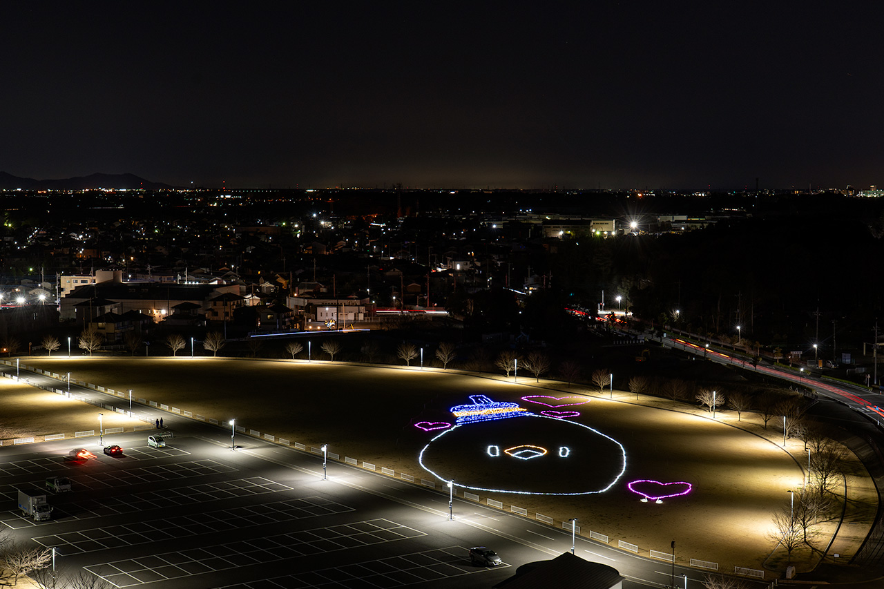 展望室からは360度の夜景を眺められ、おうら中央多目的広場には、イルミネーションで描かれた邑楽町公式キャラクター「オーランド」を見下ろせます。10分毎に起きている表情と、寝ている表情に変わる仕掛けがユニークで面白かったです。