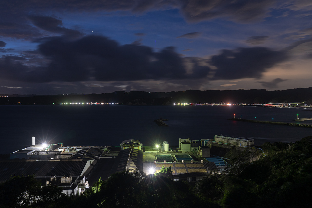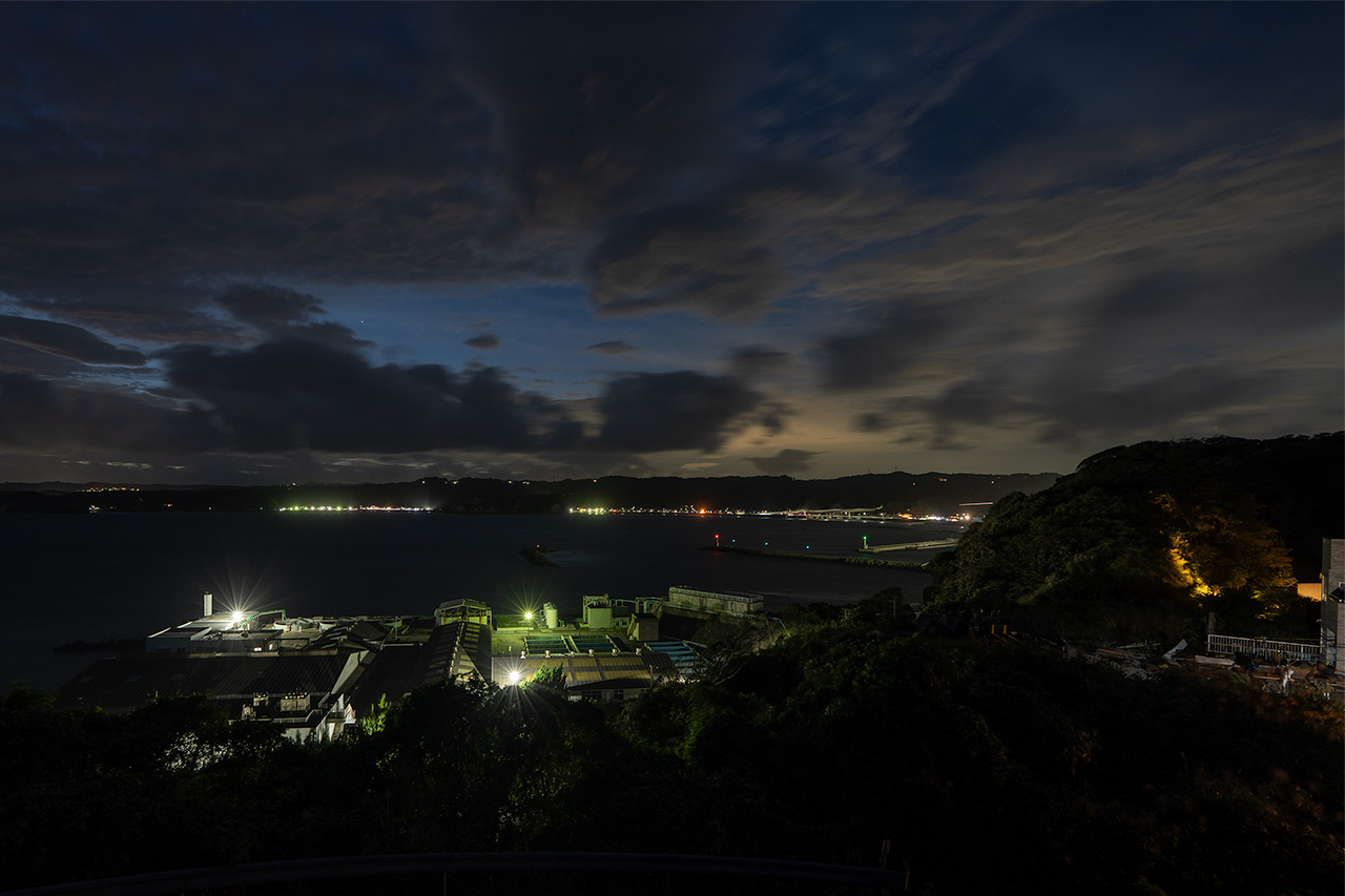 ここからは勝浦湾とその奥に「かつうら海中公園」などにある鵜原方面の夜景が望めます。また眼下には千葉県水産総合研修センターの明かりが目立ちます。ただ全体としては光量は極めて少なく、夜景よりも星空を楽しむスポットかもしれません。