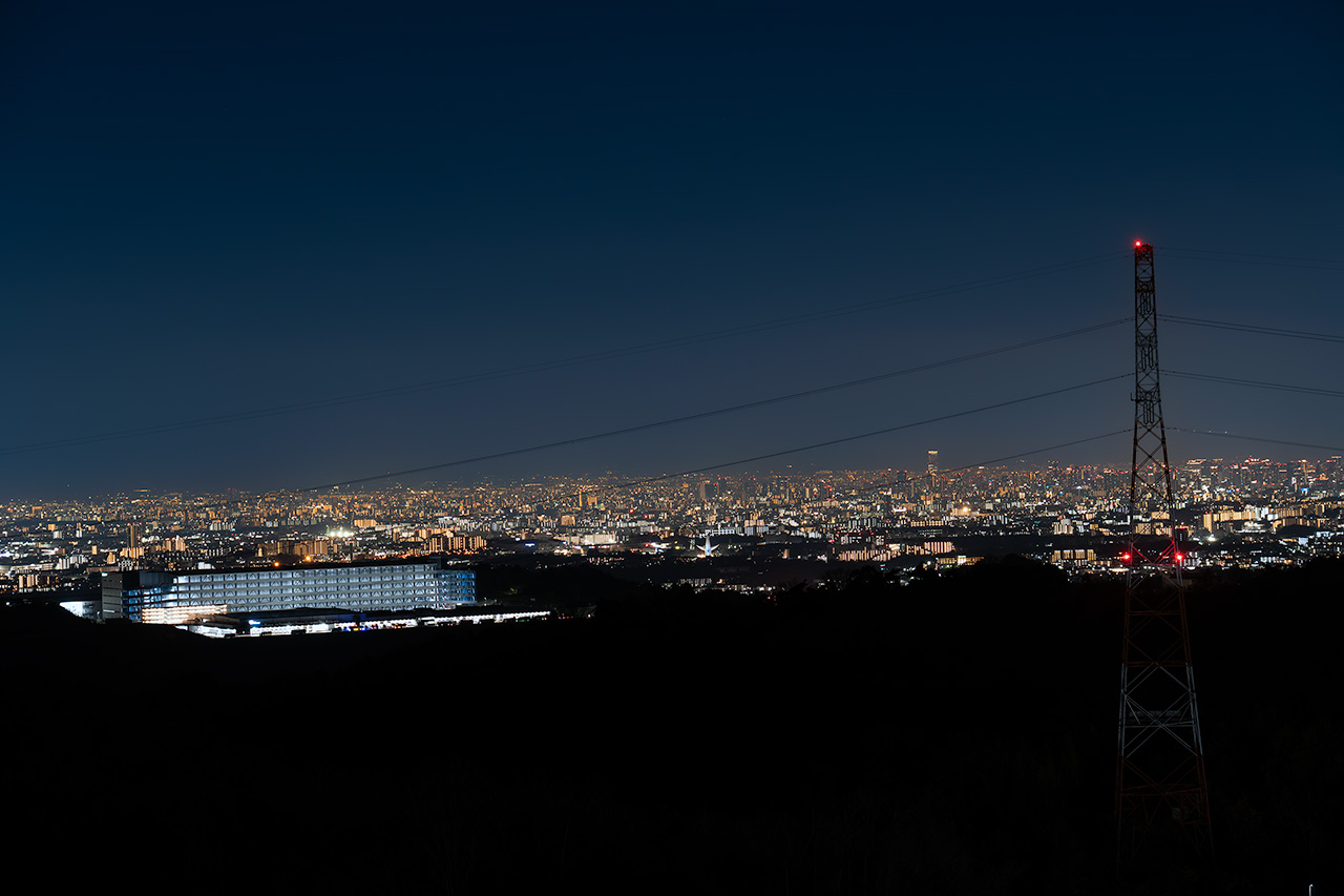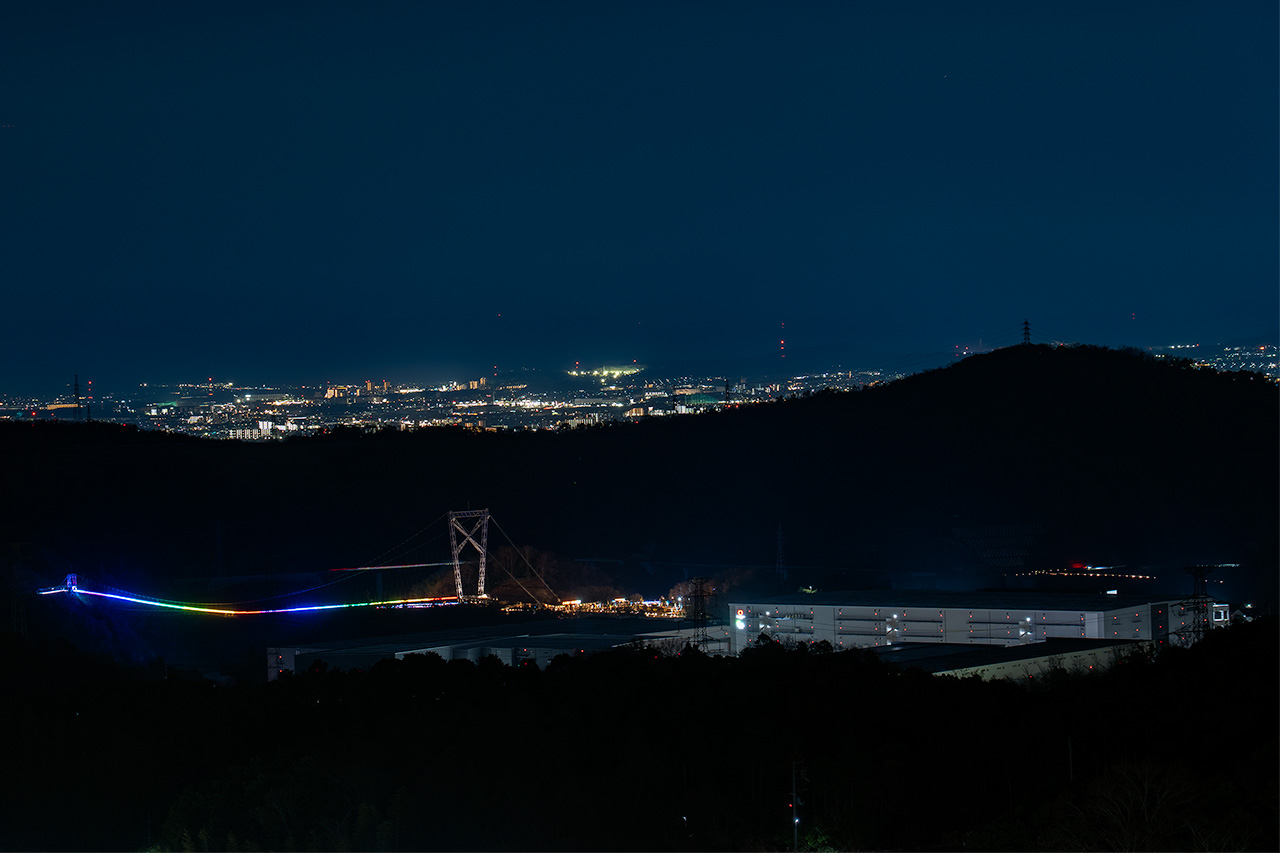 登りきった先に展望デッキがあり、視界は良好。夜景に厚みはありませんが、焦点距離14mmの超広角レンズで全景が写っているスケール感。茨木、枚方、豊中、遠くには大阪市内まで望めます。また写真左手には日本最長となる全長420mの吊り橋「GODA BRIDGE(ゴウダブリッジ)」が冬季(2025年度は2025年12月24日~2026年2月末)限定でライトアップされている様子が映っています。