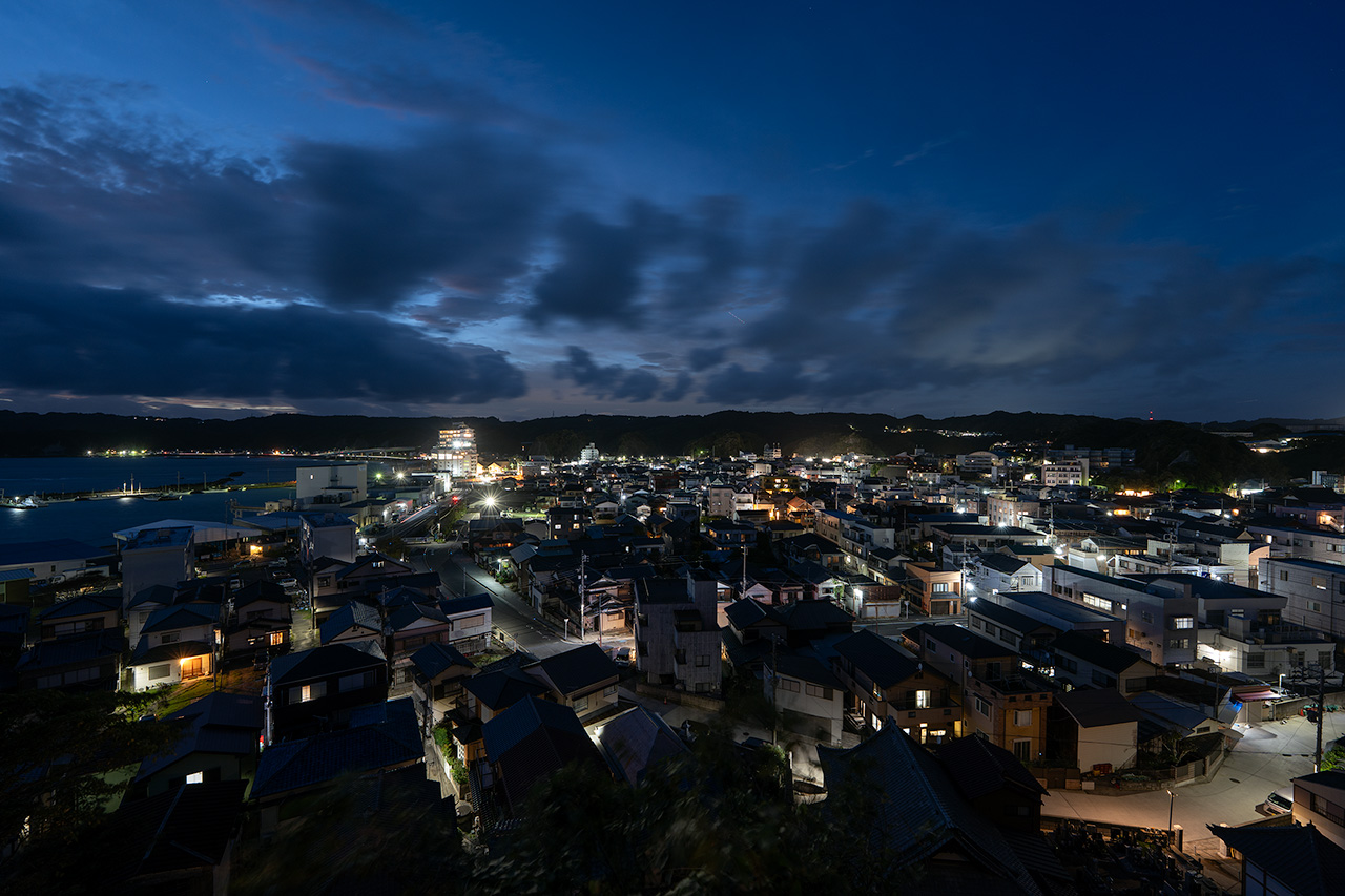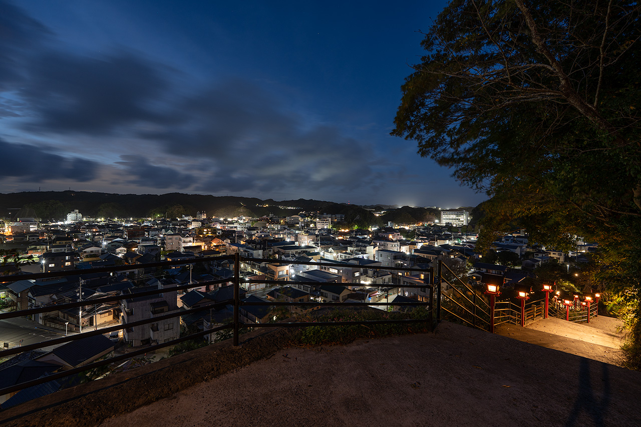 また石段を登っていくと、3分ほどで勝浦市内を見下ろせる眺望ポイントに到着します。ここからは市内中心部の夜景が一望でき、参道の点灯した灯籠と相まって美しい光景を望めます。
